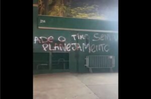 Muros da sede do Palmeiras e das bilheterias do Allianz Parque foram pichados durante a madrugada desta quarta-feira (21), após a goleada sofrida pelo Verdão por 4 a 0 para o Novorizontino. Entre os alvos das pichações estão a presidente do clube, Leila Pereira, e o técnico Abel Ferreira.