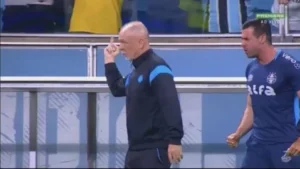 Após o gol de empate do Grêmio Mano Menezes não gostou de algo que ouviu dos torcedores e mostrou o dedo do meio para a torcida.
